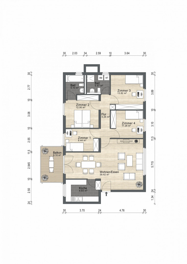 Balkon: 9,10 m² = 50% WFL. = 4,55 m²