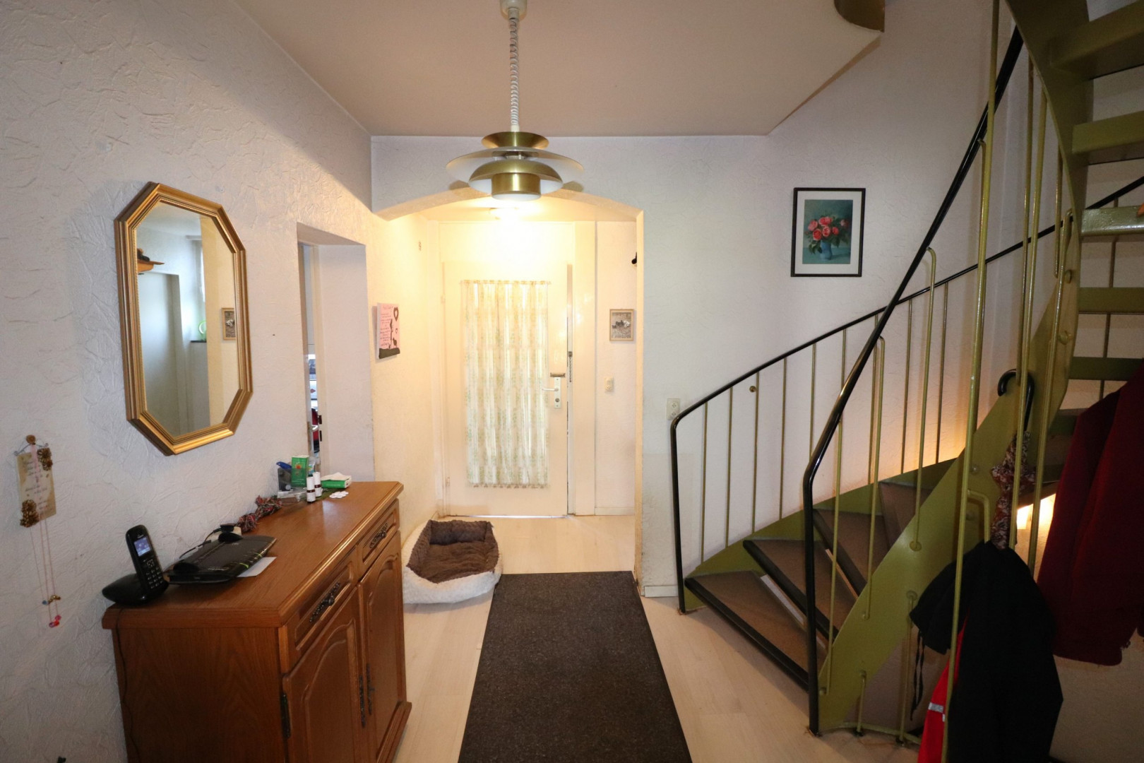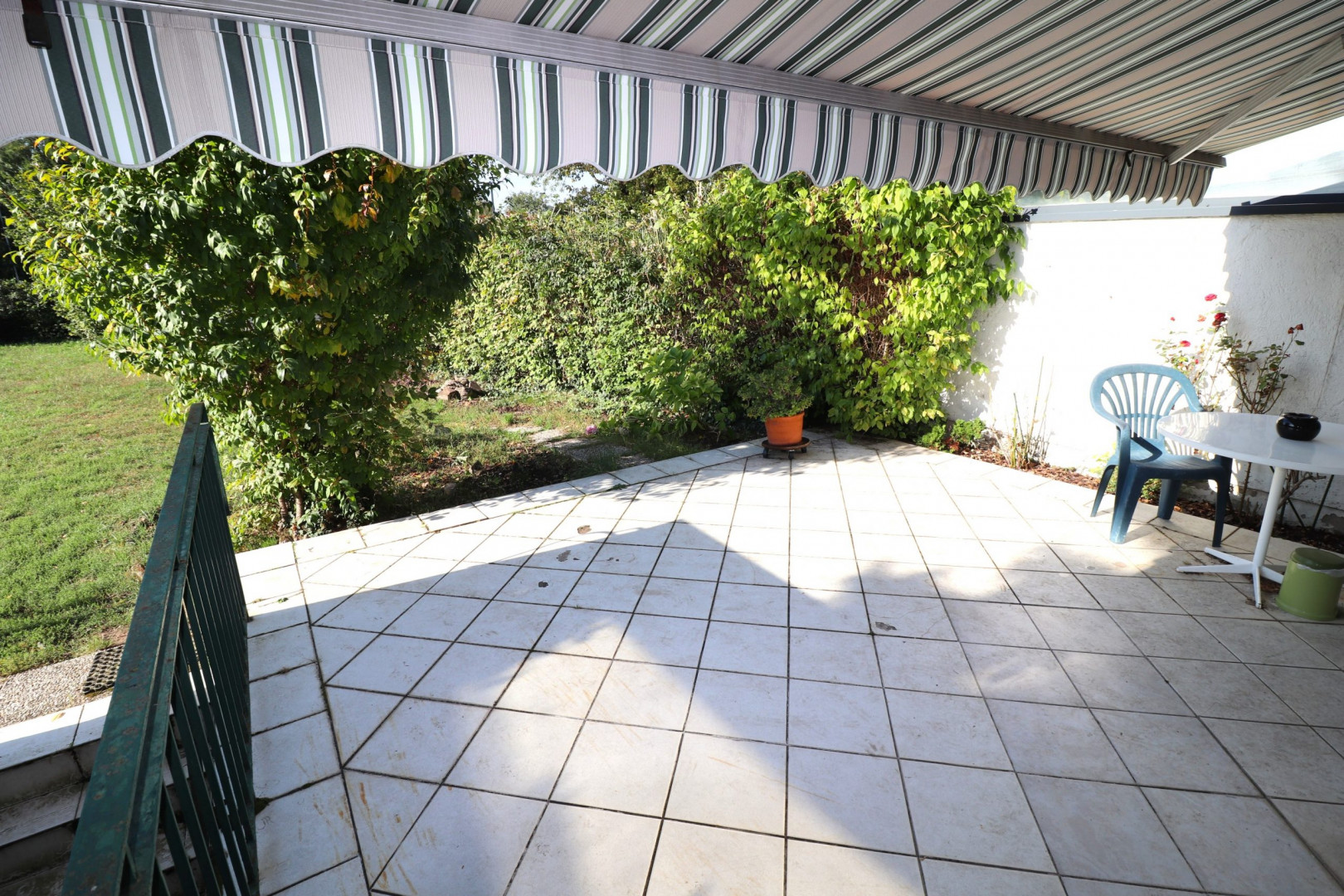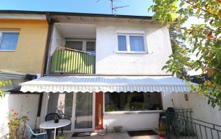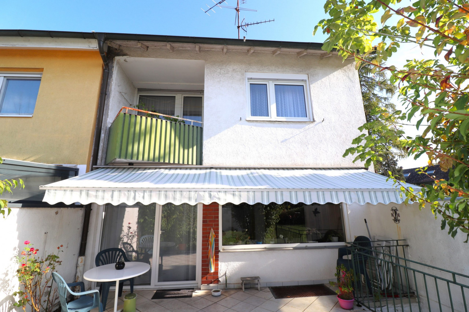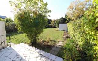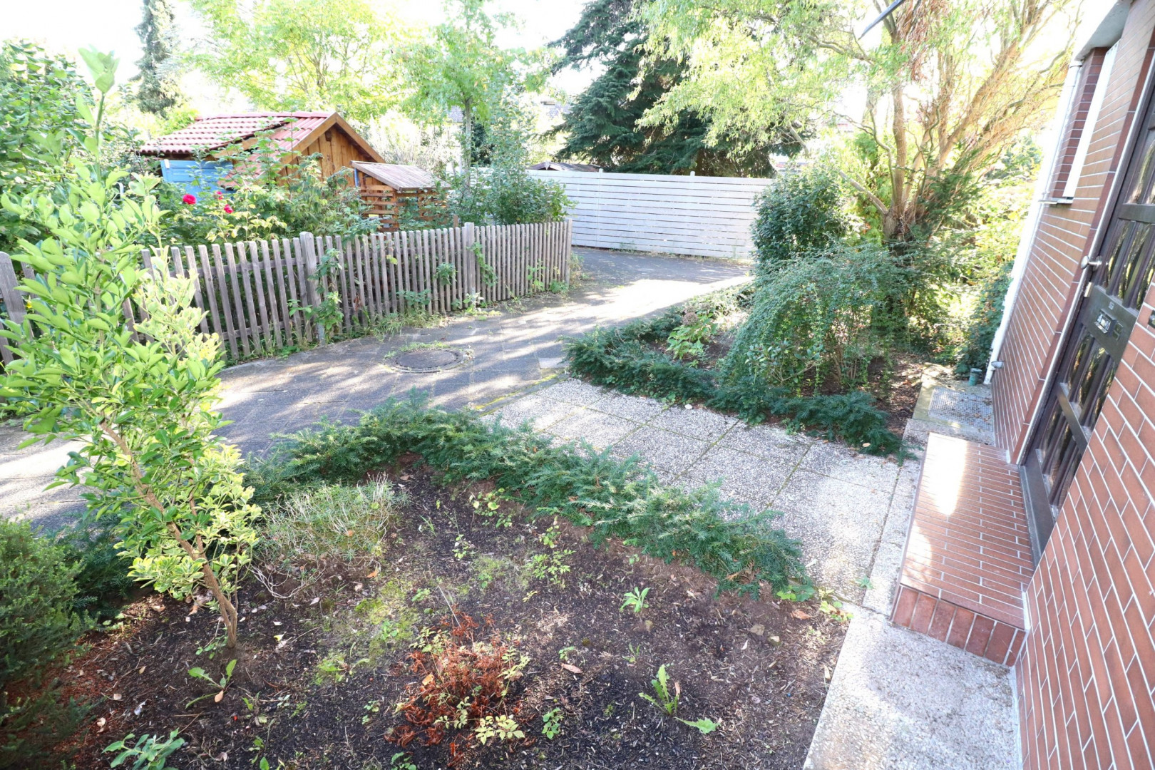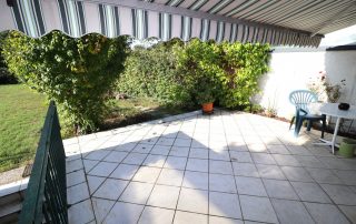 Die Terrasse ist mit einer großflächigen elektrischen Markise ausgestattet. Eine Einzelgarage befindet sich auf dem Grundstück und ermöglicht per Seitentür einen direkten Zugang vom Gartenbereich.