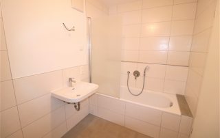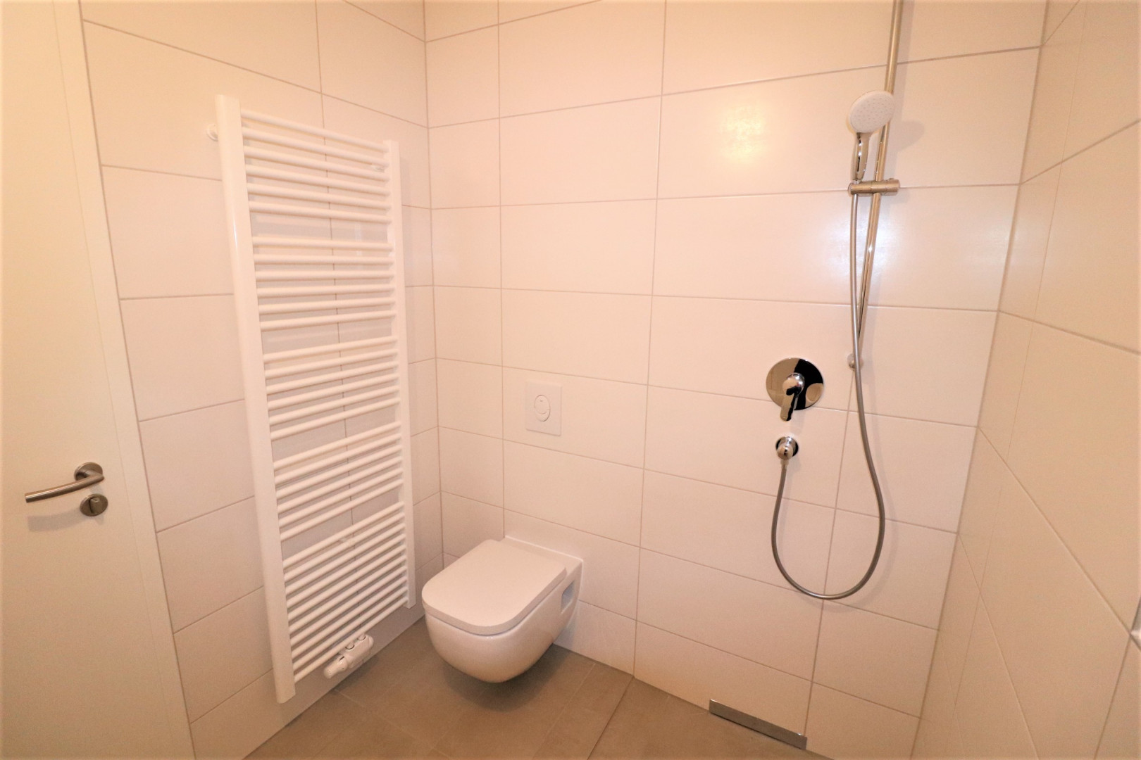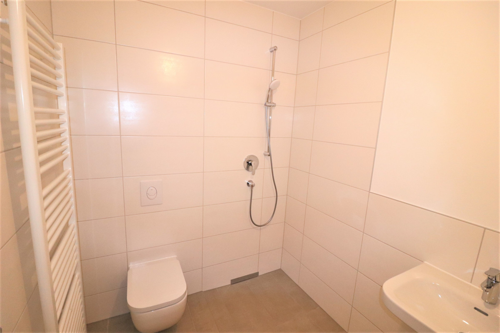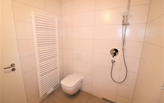 • Wand-WC, Waschtisch, Handtuchheizkörper, deckenhoch gefliest