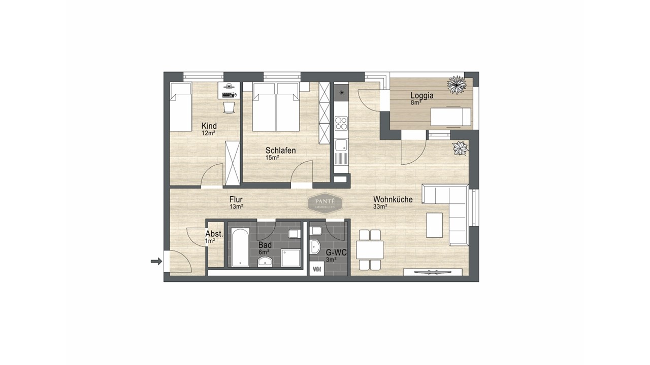 Loggia 8,00 m² = 100% | 50% zur WFL = 4,00 m²