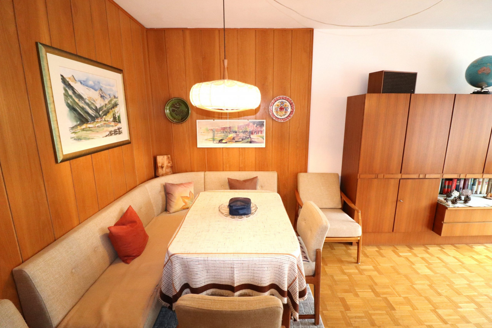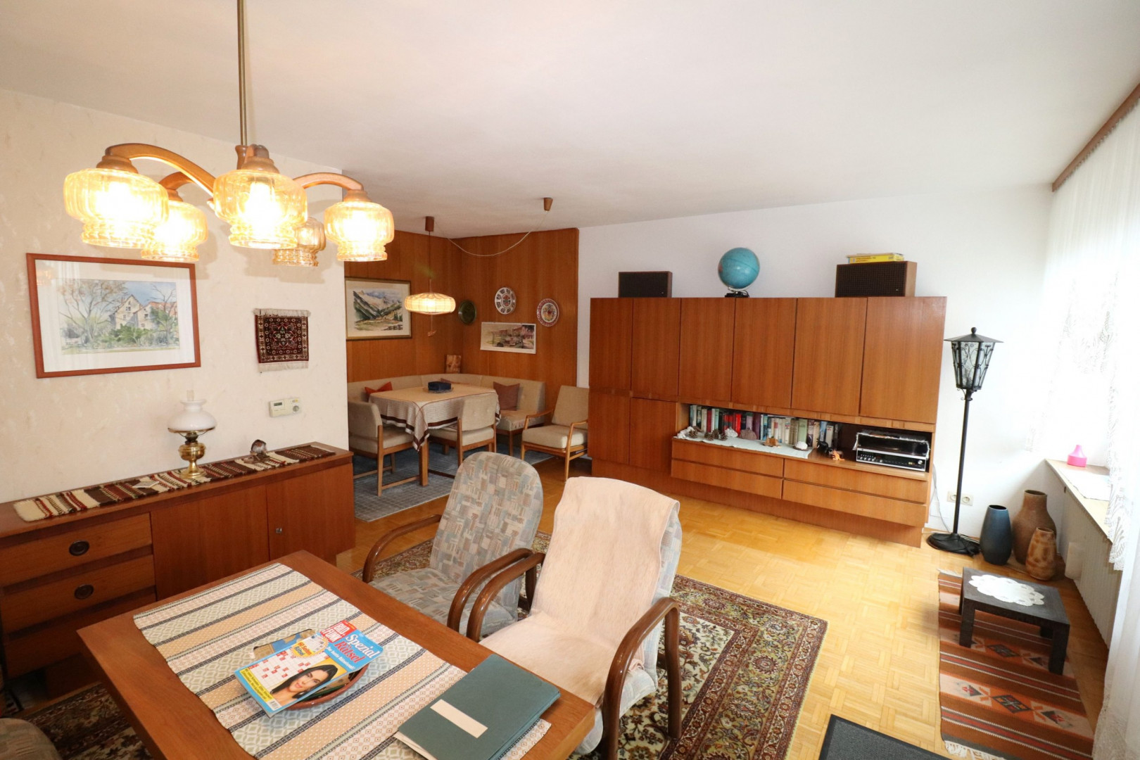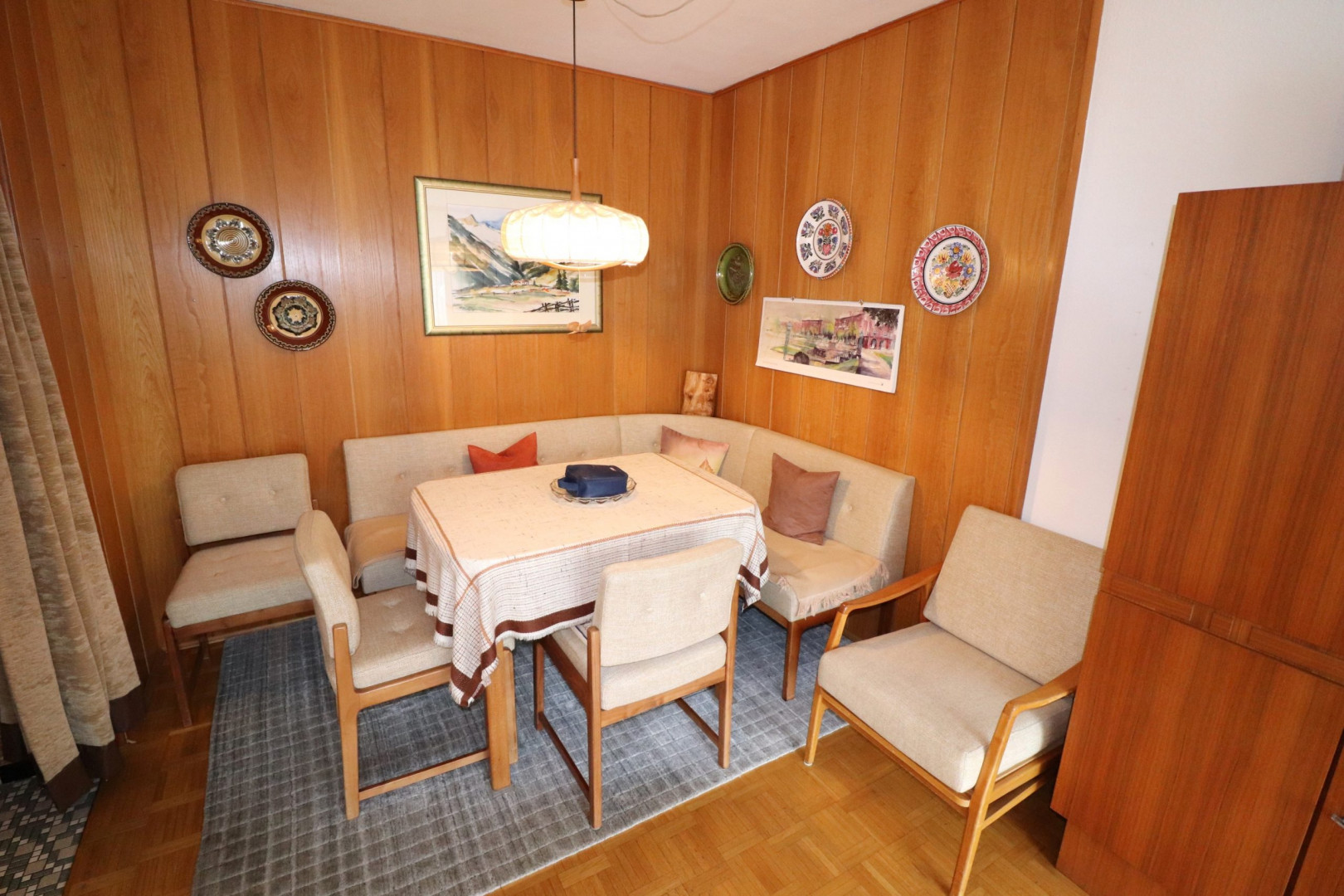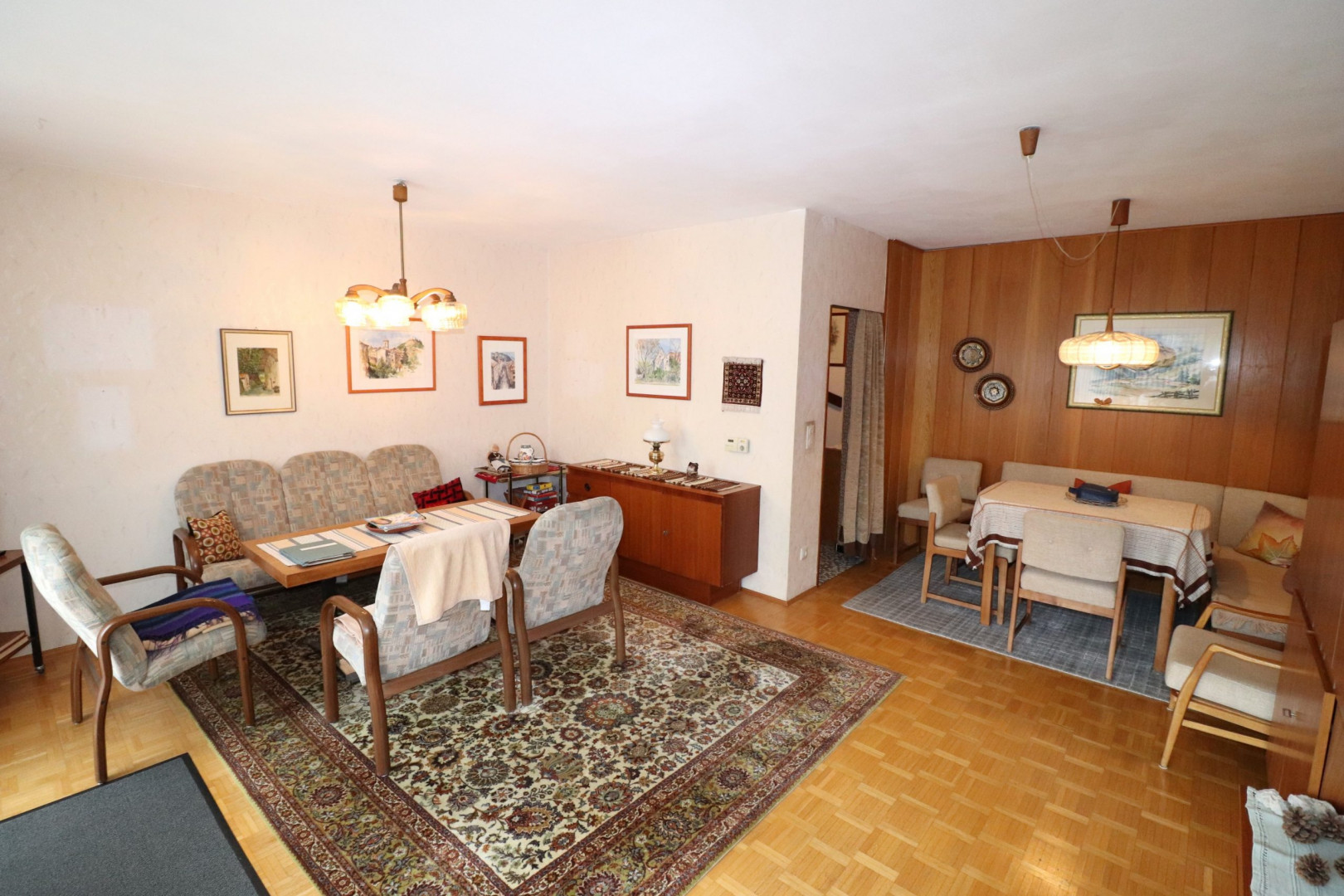 - Innenwandbeläge: Feinputz, tapeziert und gestrichen, teilweise Holzvertäfelung